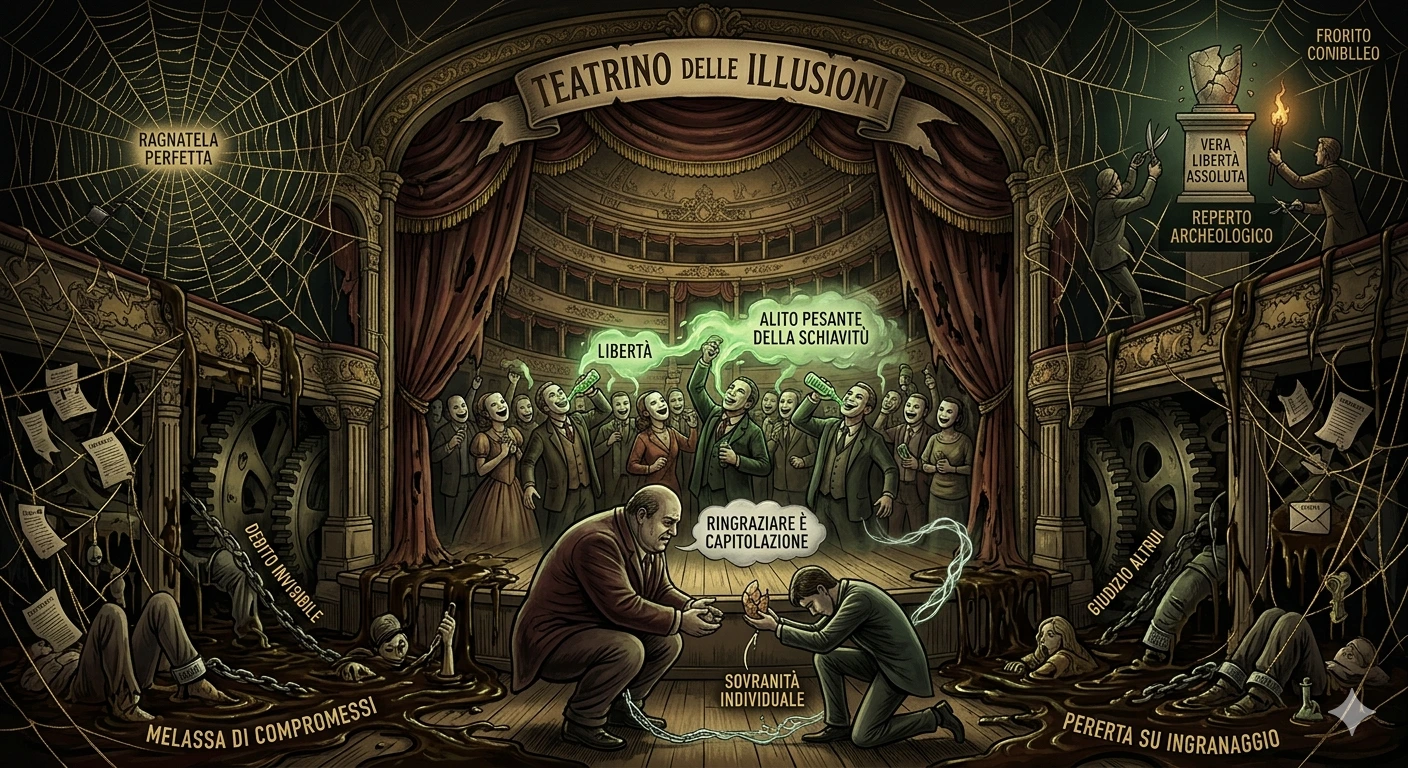 Definirsi liberi mentre si dipende da un sistema, da un giudizio o da una rete di favori è la barzelletta più triste del secolo. La società moderna è una ragnatela perfetta, dove ogni filo è un debito invisibile che hai contratto senza nemmeno accorgertene. Ti senti autonomo ma sei solo un ingranaggio che gira perché qualcuno, da qualche parte, ha oliato il meccanismo, e quel lubrificante ha un prezzo che prima o poi dovrai pagare. Non esiste il pasto gratis e non esiste l'azione pura. Ogni tua scelta è filtrata attraverso il setaccio di ciò che è conveniente, accettabile o semplicemente possibile all'interno di questo recinto dorato che chiamiamo collettività.
