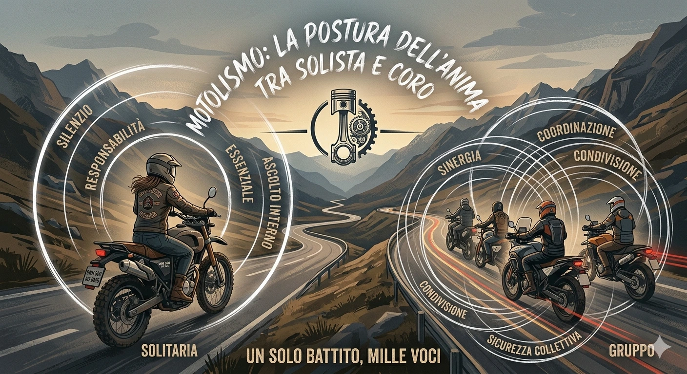 Il Motolismo suggerisce che non esiste una regola fissa, ma una necessità di equilibrio. Viaggiare da soli serve per ritrovarsi, per pulire il lettino dalle interferenze e tornare all'essenza del movimento. Viaggiare in gruppo serve per testare la nostra capacità di stare nel mondo senza imporci, per imparare a collaborare con la realtà altrui così come collaboriamo con l'asfalto.
